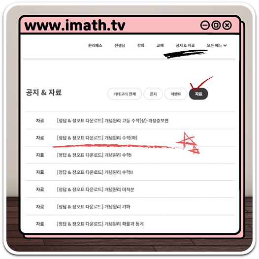 리스트에서 '개념원리 수학(하)' 항목을 클릭하면 답지 제공 페이지로 이동합니다.(다른 교재의 답지 다운로드 방법도 이와 동일합니다.)